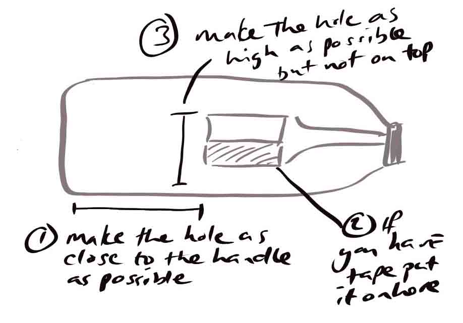 - The cut should be as high as you can make it in the side, at least 2/3 of the way up. This stops beetles and other insects getting into the beer.